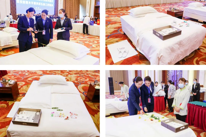 客房服務(wù)參賽選手甩單動(dòng)作特別瀟灑,雙手抓住床單的兩角,只聽“嘩”的一聲,床單向床頭飛出,隨即往下一按,一手平伸一撫,一手輕抬床墊,撫床單的手再做成手刀往床底下一砍,床單的一角就坦蕩如砥地壓在床墊下,有條不紊、一氣呵成的動(dòng)作頻繁劃出了一道道優(yōu)美的弧線,床腳呈現(xiàn)出一個(gè)標(biāo)準(zhǔn)的90度,四周緊密無褶皺,3分鐘內(nèi)鋪就了一張張舒適、整潔、美觀的床;創(chuàng)意新穎、實(shí)用性強(qiáng)、藝術(shù)感好的一件件夜床作品凸顯了客房服務(wù)參賽選手對(duì)賓客的感動(dòng)式服務(wù)、個(gè)性化關(guān)懷,這是充分體現(xiàn)一個(gè)酒店細(xì)節(jié)服務(wù)的很好途徑。