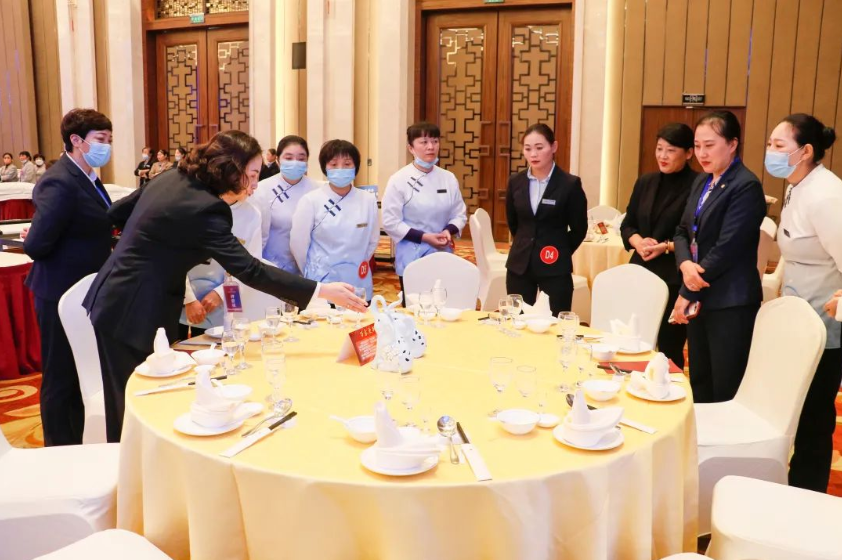 第五屆崗位技能大賽設(shè)有客房服務(wù)(分為A、B兩組)、餐廳服務(wù)(分為A、B兩組)、前廳服務(wù)(分為A、B兩組)、熱菜制作、冷菜制作、精細(xì)刀工、保安實(shí)操、工程維修、財(cái)務(wù)技能共計(jì)9個(gè)比賽項(xiàng)目,經(jīng)過參賽單位或部門學(xué)習(xí)標(biāo)準(zhǔn)、組織培訓(xùn)、強(qiáng)化練習(xí)和層層選拔,參賽選手充分利用一切可以利用的業(yè)余時(shí)間,盡管日常工作后有些許勞累,卻依然毫無怨言地苦練崗位技能、用心奮力備賽。在主持人宣布第五屆崗位技能大賽開始后,身穿職業(yè)裝、佩戴評(píng)委證的大賽評(píng)委偕同身著工作裝、別著參賽牌的參賽選手,精神抖擻、笑容滿面地邁著整齊有力的步伐向各比賽區(qū)挺進(jìn)。