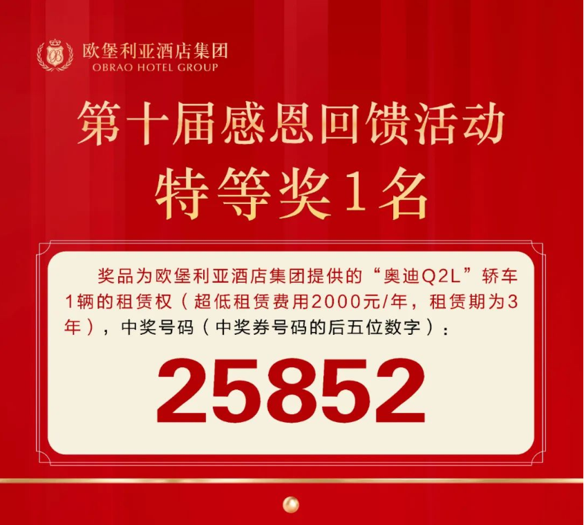 為感恩社會各界人士及廣大賓客朋友長期以來的關(guān)注與支持、信賴與同行,2022年12月28日20時,“歐堡利亞酒店集團第十屆感恩回饋活動”仍以線上直播的方式揭開了序幕,社會各界人士、歐堡利亞酒店賓客朋友12萬多人通過“歐堡利亞酒店集團微信公眾平臺”和“智慧濱海APP”,激情觀看了抽獎直播,在線見證了本屆活動五個獎項中獎號碼的現(xiàn)場產(chǎn)生,享受或分享中得“奧迪Q2L-35TFSI”轎車1輛的3年租賃權(quán)、歐堡利亞一卡通15萬元的喜悅和以20元秒殺搶到歐堡利亞一卡通現(xiàn)金券100元(總計6萬元)、超低價搶購歐堡利亞酒店集團旗下各酒店相關(guān)產(chǎn)品的刺激。