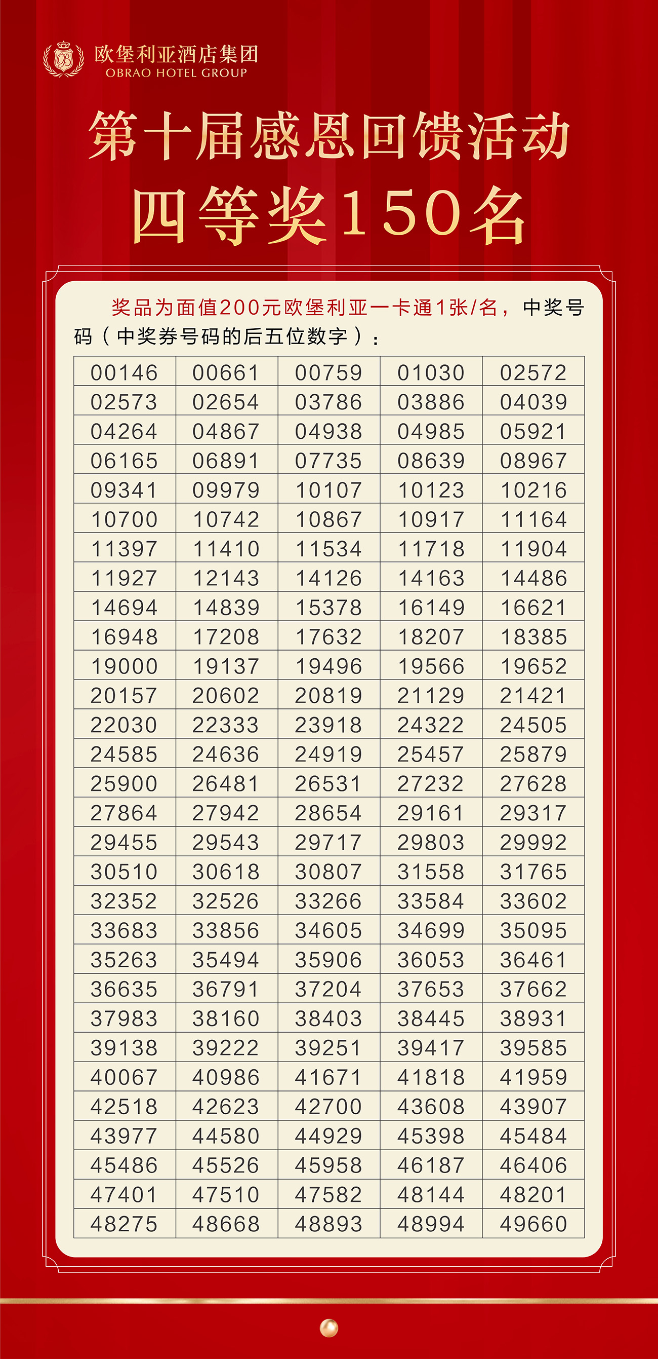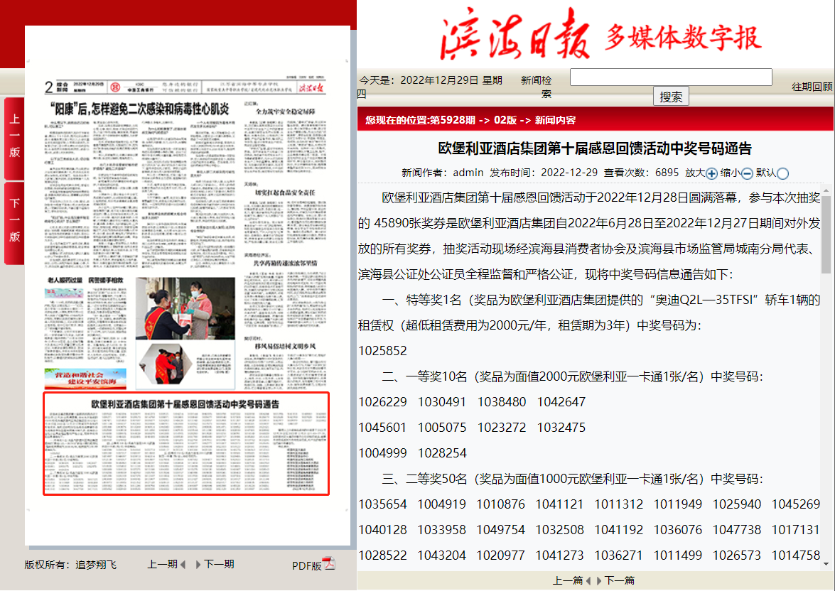 2022年12月29日,歐堡利亞酒店集團第十屆感恩回饋活動五個獎項的311個中獎號碼均已刊登在《濱海日報》上。