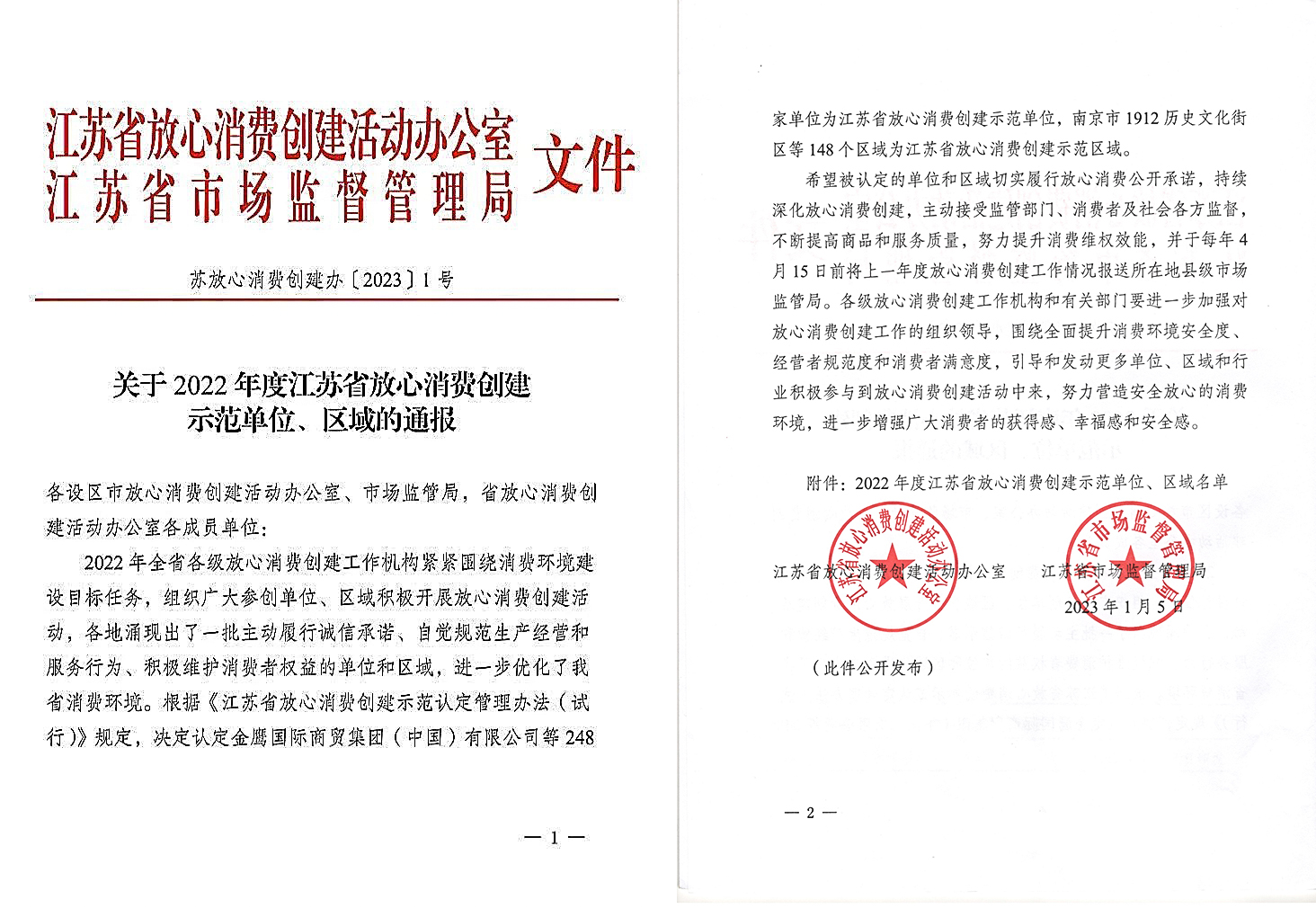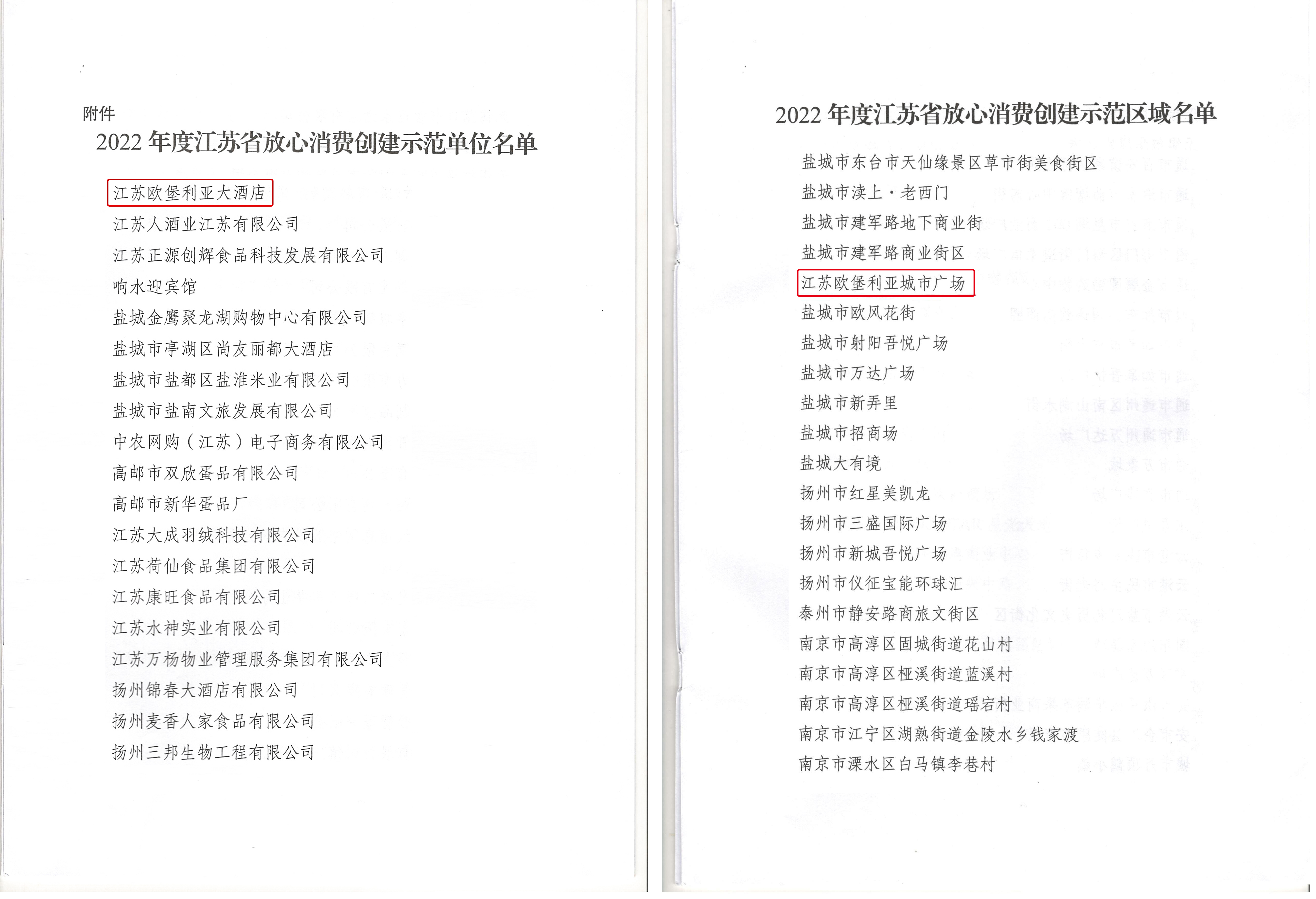 為認(rèn)真履行放心消費(fèi)承諾,持續(xù)深化放心消費(fèi)創(chuàng)建,賡續(xù)提高商品服務(wù)質(zhì)量,不斷提升消費(fèi)維權(quán)效能,著力構(gòu)建放心消費(fèi)環(huán)境,切實(shí)增強(qiáng)廣大消費(fèi)者的獲得感、幸福感和安全感,江蘇省放心消費(fèi)創(chuàng)建活動(dòng)辦公室、江蘇省市場(chǎng)監(jiān)督管理局聯(lián)袂開展了 “江蘇省2022年度放心消費(fèi)紅名單”認(rèn)定工作,根據(jù)《江蘇省放心消費(fèi)創(chuàng)建示范認(rèn)定管理辦法》的規(guī)定,近日決定認(rèn)定江蘇歐堡利亞城市廣場(chǎng)等148個(gè)區(qū)域?yàn)椤敖K省放心消費(fèi)創(chuàng)建示范區(qū)域”、江蘇歐堡利亞大酒店等248家單位為“江蘇省放心消費(fèi)創(chuàng)建示范單位”。