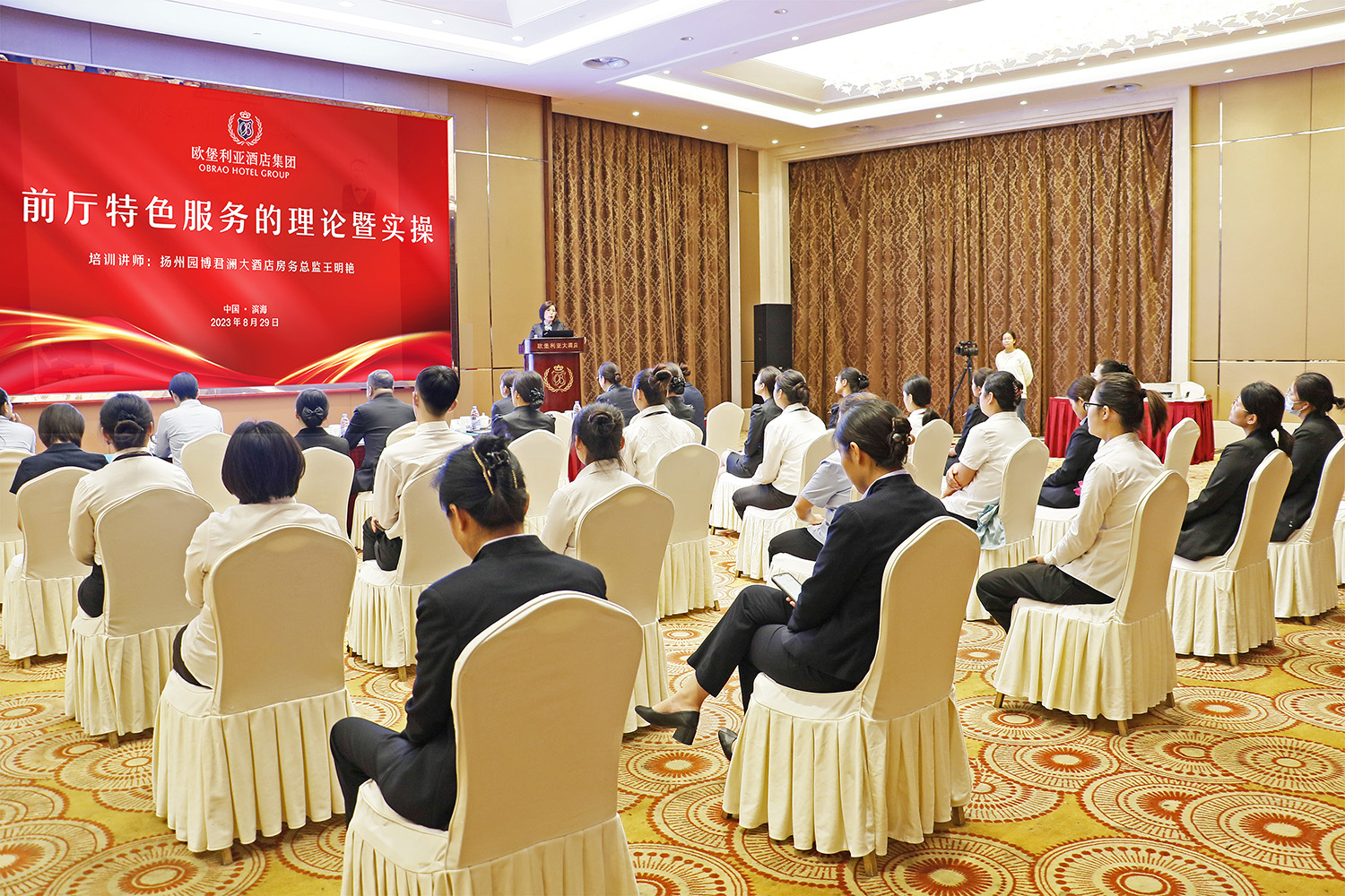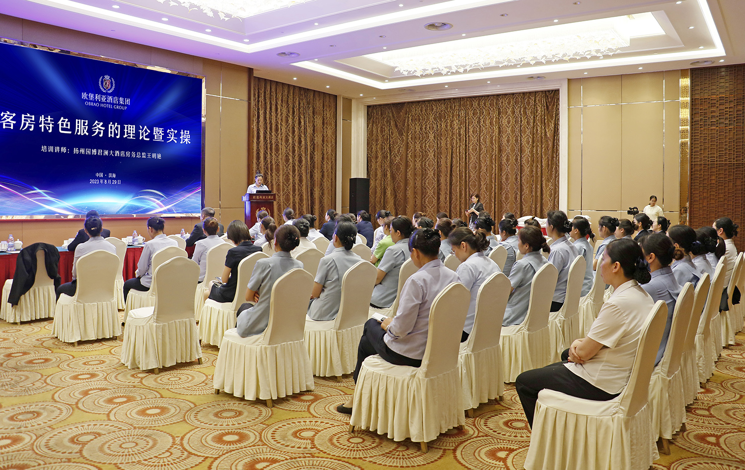 隨著后疫情時代的消費需求全面復蘇,賓客對酒店所提供的產品提出了更多和更高的要求,賓客到酒店入住、來酒店就餐,購買消費的不僅是固有的設施、簡單的飯菜,更重要的是一種品質體驗。品質是酒店生存、發(fā)展的靈魂和生命,也是酒店在日臻激烈的市場競爭中始終處于不敗之地的核心競爭力。為賡續(xù)加強歐堡利亞酒店的品質建設,切實提升歐堡利亞酒店參與市場競爭的軟實力,充分彰顯歐堡利亞酒店的品牌美譽度和社會影響力,2023年8月29-31日,歐堡利亞酒店集團特邀請揚州園博君瀾大酒店房務總監(jiān)王明艷女士、浙江世貿君瀾大飯店餐飲經理陳敏烈先生、杭州國壽君瀾大飯店行政總廚鐘堅先生分別對前廳部、客房部、餐飲部、廚房部四大運營部門作專題培訓,歐堡利亞酒店集團旗下12家酒店的406名員工通過線上線下相結合的培訓方式,分別在歐堡利亞大酒店多功能廳、歐堡利亞建湖江南明灶杭州廳參加了四場理論暨實操的專題培訓。