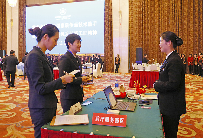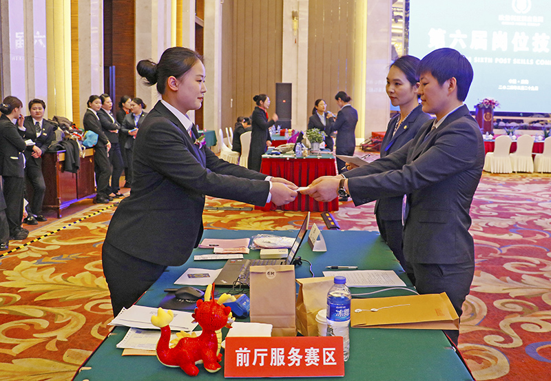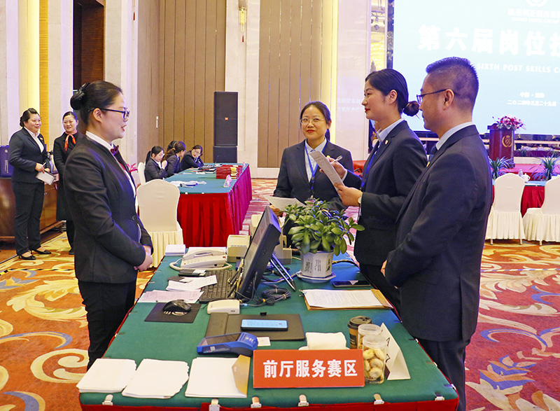 ▲前廳服務(wù)比賽現(xiàn)場(A組、B組)前廳服務(wù)參賽選手通過12分鐘的情景模擬,自然嫻熟地完成了接受預(yù)訂、辦理入住、結(jié)賬退房、抽題答題的考核環(huán)節(jié),流利清晰的語言表達、規(guī)范標(biāo)準的操作流程、優(yōu)質(zhì)高效的接待水平、靈活敏捷的應(yīng)變能力、盡善盡美的對客服務(wù),讓大賽評委和觀摩人員領(lǐng)略到前廳部被堪稱為整個酒店神經(jīng)中樞的關(guān)鍵所在。