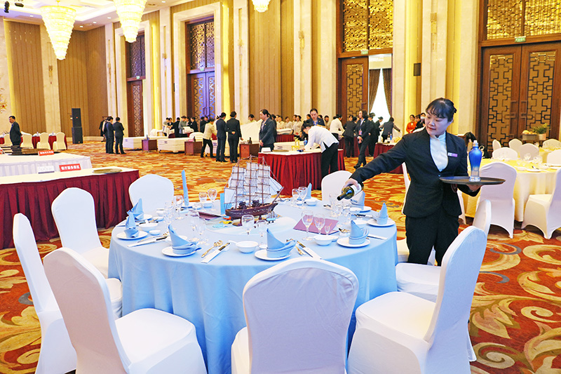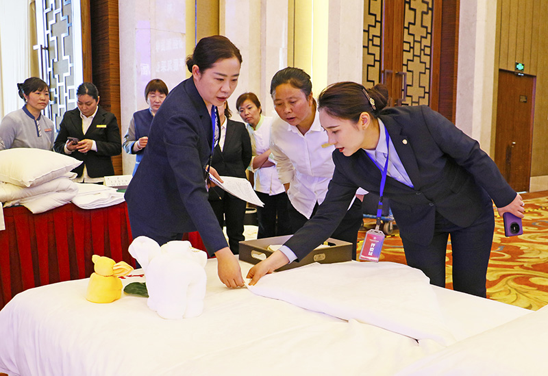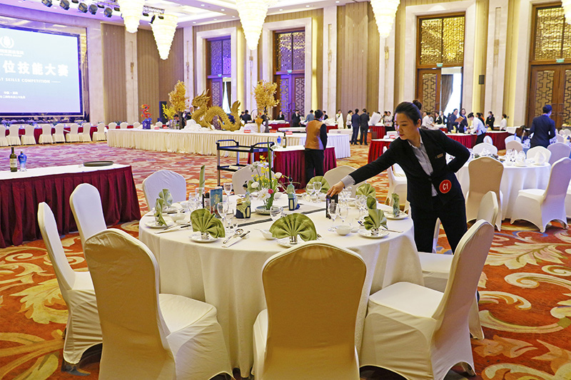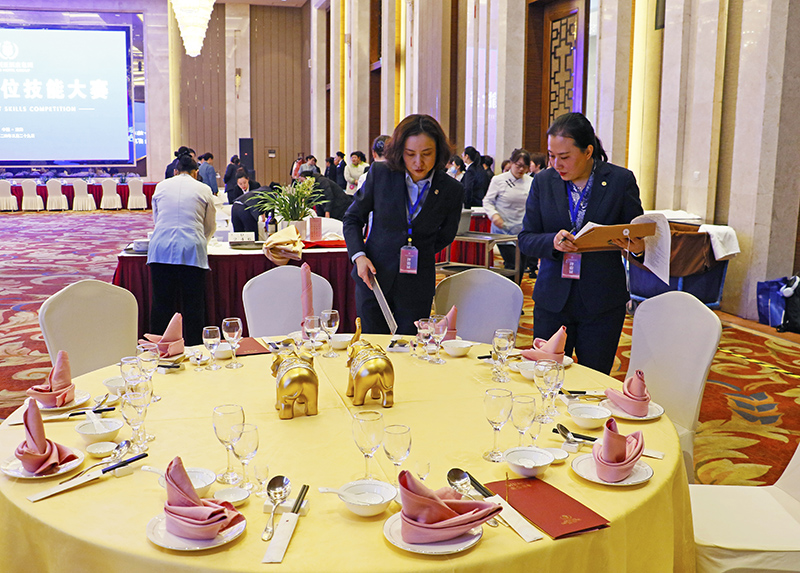 第六屆崗位技能大賽設(shè)有客房服務(wù)(分為A、B兩組)、餐廳服務(wù)(分為A、B兩組)、前廳服務(wù)(分為A、B兩組)、熱菜制作、冷菜制作、精細刀工、保安實操、工程維修共計8個比賽項目,經(jīng)過參賽單位學(xué)習(xí)標(biāo)準、組織培訓(xùn)、強化練習(xí)、層層選拔、提前預(yù)賽,參賽選手充分利用一切可以利用的業(yè)余時間,盡管日常工作后有些許勞累,卻依然無怨無悔地苦練崗位技能、用心奮力備賽。在主持人宣布第六屆崗位技能大賽開始后,身穿職業(yè)裝、佩戴評委證的大賽評委偕同身著工作裝、別著參賽牌的參賽選手,精神抖擻、笑容滿面地邁著鏗鏘有力、整齊劃一的步伐走向各比賽區(qū)。