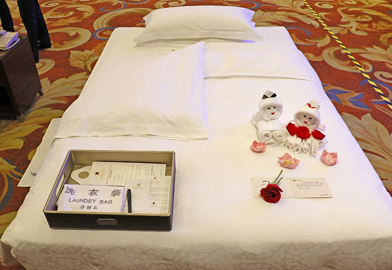 客房服務(wù)參賽選手甩單動作特別瀟灑,雙手抓住床單的兩角,只聽“嘩”的一聲,床單向床頭飛出,隨即往下一按,一手平伸一撫,一手輕抬床墊,撫床單的手再做成手刀往床底下一砍,床單的一角就坦蕩如砥地壓在床墊下,有條不紊、一氣呵成的動作頻繁劃出了一道道優(yōu)美的弧線,床腳呈現(xiàn)出一個標(biāo)準的90度,四周緊密無褶皺,3分鐘內(nèi)鋪就了一張張舒適、整潔、美觀的床;創(chuàng)意新穎、實用性強、藝術(shù)感好的一件件夜床作品凸顯了客房服務(wù)參賽選手對賓客的感動式服務(wù)、個性化關(guān)懷,這是充分體現(xiàn)一個酒店細節(jié)服務(wù)的很好途徑。