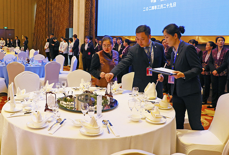 餐廳服務(wù)參賽選手面帶微笑、步履輕盈、全神貫注、有條不紊,一舉一動間迸發(fā)出規(guī)范、標(biāo)準、優(yōu)雅、自信,輕輕一拋、準確無誤地將臺布十字居中地鋪在餐桌上,又從主人位開始拉椅定位,麻利地將碗、碟、盤、勺、筷架、筷子、三套杯等一整套光潔的餐具依序擺開,整個桌面呈現(xiàn)出層次分明、中心對稱的擺臺造型;擺放好餐具后,參賽選手旋即拿起了一塊平淡無奇的餐巾,竟能折出多種花型,頓時使擺放整齊美觀的餐具增添了藝術(shù)美感。