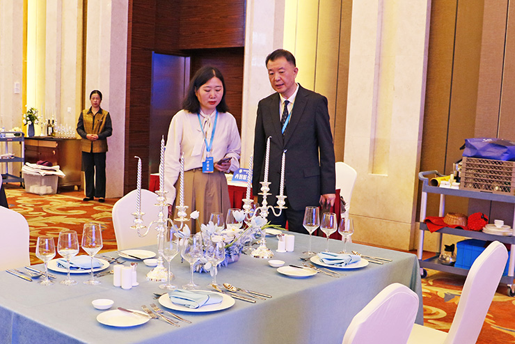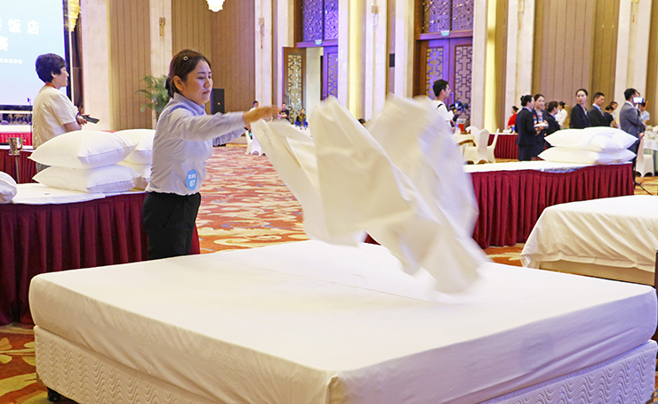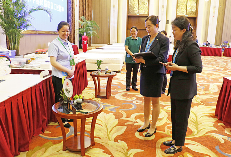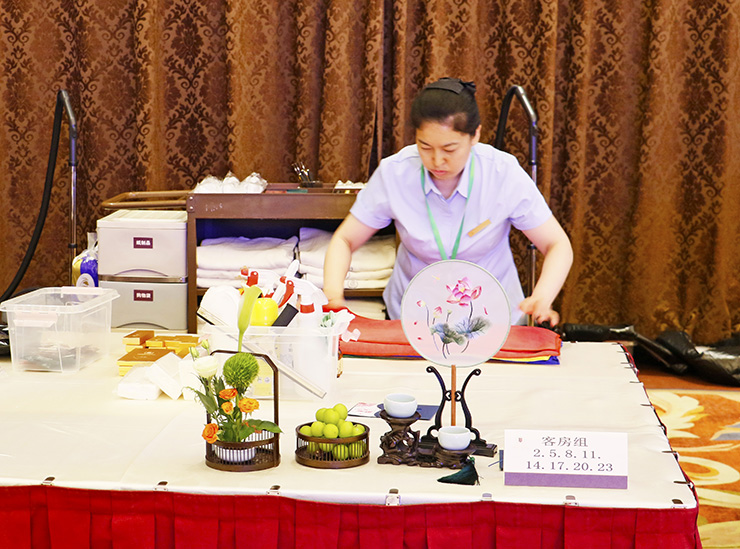 ▲2024鹽城星級(jí)旅游飯店服務(wù)技能選拔賽開幕式此次選拔賽設(shè)前廳服務(wù)、客房服務(wù)、中餐服務(wù)、西餐服務(wù)四個(gè)競賽項(xiàng)目,均分為理論考試、技能操作兩項(xiàng)考核,理論考試內(nèi)容涉及了近期國內(nèi)時(shí)事政治、飯店服務(wù)專業(yè)知識(shí),所有參賽選手均須參加45分鐘內(nèi)完成80道單選題及多選題的理論考試;技能操作要從行業(yè)規(guī)范知識(shí)、服務(wù)操作技能、英語口語表達(dá)、語言溝通協(xié)調(diào)、突發(fā)事件應(yīng)對(duì)等方面,著重對(duì)前廳服務(wù)(儀容儀表、入住登記、結(jié)賬服務(wù)、用英語介紹飯店及旅游文化資源信息、用英語回答前廳服務(wù)知識(shí))、客房服務(wù)(儀容儀表、準(zhǔn)備工作車、鋪床、VIP禮遇小品設(shè)計(jì))、中餐服務(wù)(儀容儀表、中餐宴會(huì)擺臺(tái)、主題餐巾折花設(shè)計(jì)與布置、著名菜品推介)、西餐服務(wù)(儀容儀表、西餐宴會(huì)擺臺(tái)、西餐宴會(huì)服務(wù)、用英語回答西餐服務(wù)知識(shí))等內(nèi)容加以考查。▲前廳服務(wù)實(shí)操比賽現(xiàn)場▲客房服務(wù)實(shí)操比賽現(xiàn)場