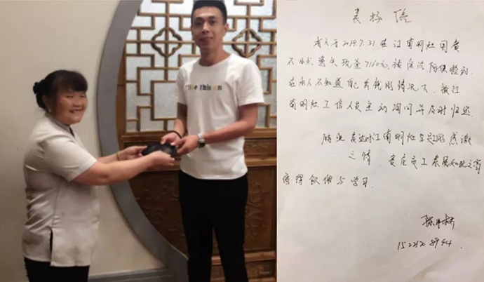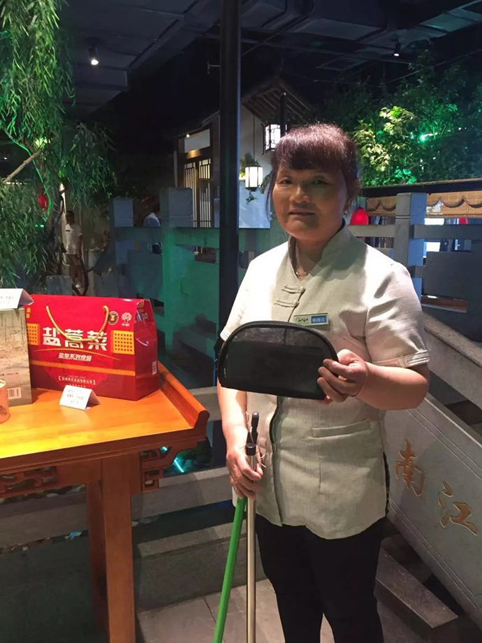 2019年7月31日中午,歐堡利亞江南明灶保潔員楊海云在打掃2樓公共區(qū)域衛(wèi)生時,驀然發(fā)現(xiàn)賓客等位區(qū)的長椅上有一只透明、鼓鼓的黑色錢包, 看上去現(xiàn)金就有好幾千元。盡管她的家庭并不富裕,上有老下有小,保潔崗工資也較微薄,但面對金錢的巨大誘惑,她表現(xiàn)得十分坦然,第一時間內(nèi)將錢包交到了收銀臺,并在2名收銀員的共同見證下,得知錢包中有7160元的現(xiàn)金。等候10分鐘還不見失主前來認(rèn)領(lǐng),收銀員便立即向酒店領(lǐng)導(dǎo)匯報(bào),并在服務(wù)部管理人員逐一詢問現(xiàn)場就餐的賓客后,最終在包廂A11找到了錢包的失主。