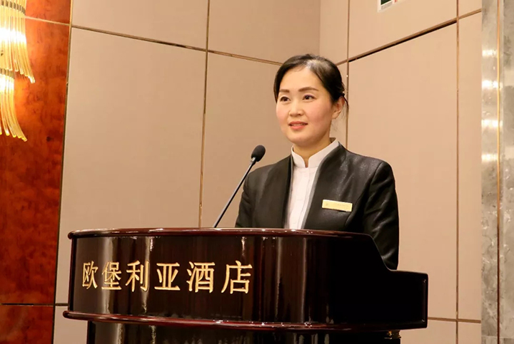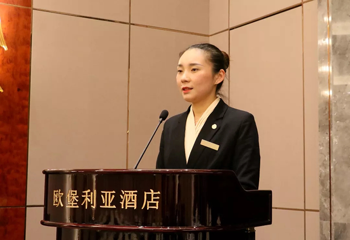 ▲歐堡利亞北辰酒店餐飲部副經(jīng)理龔蓮蓮表態(tài)發(fā)言
