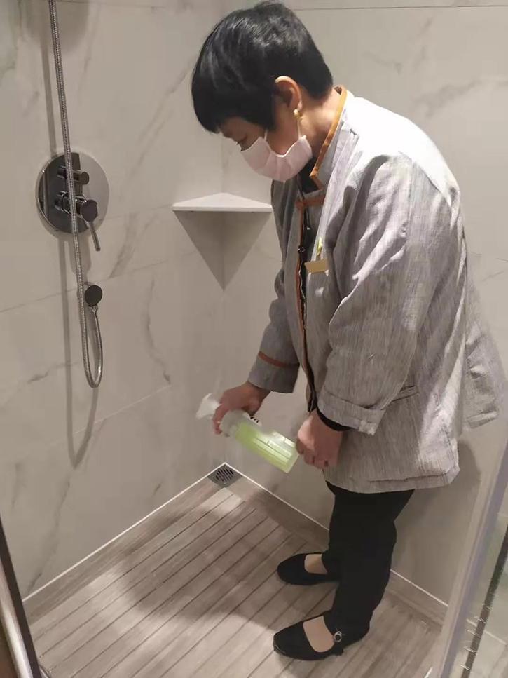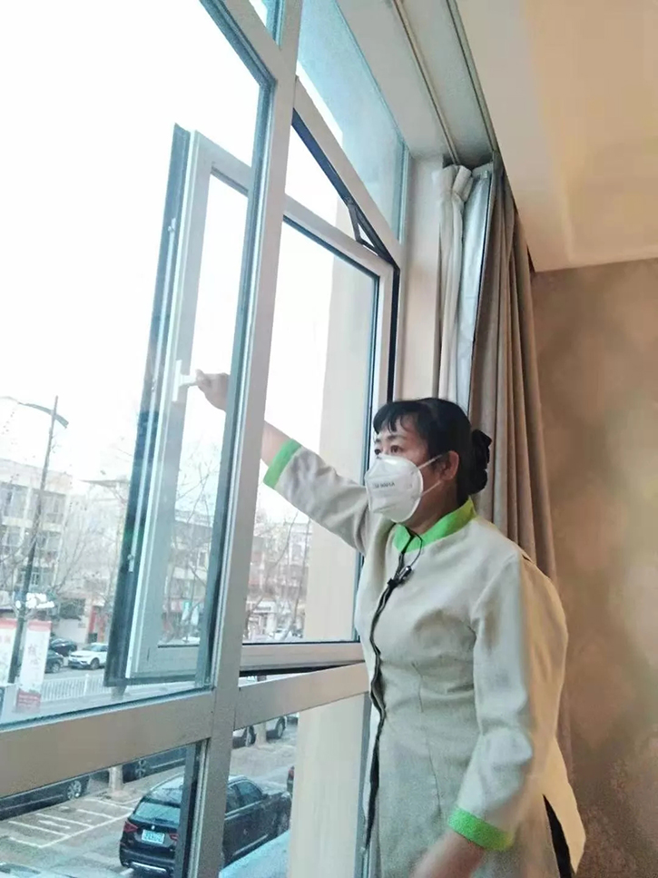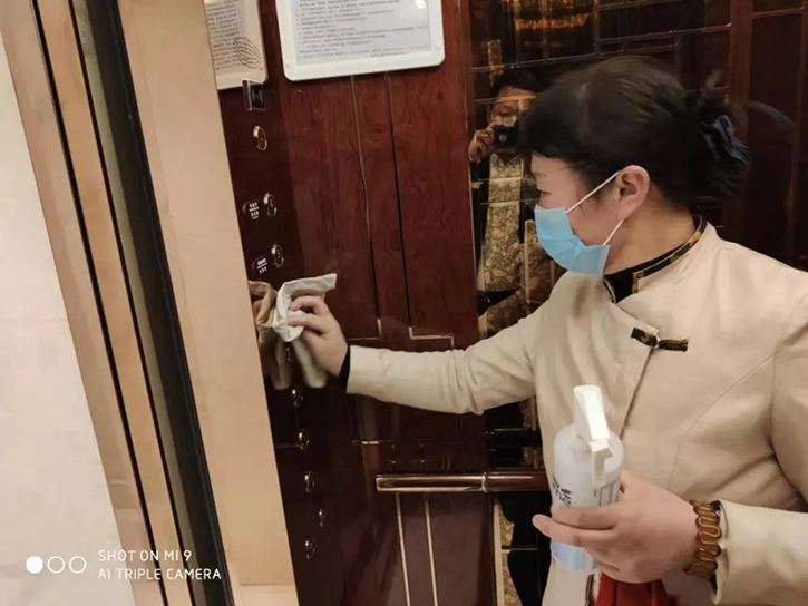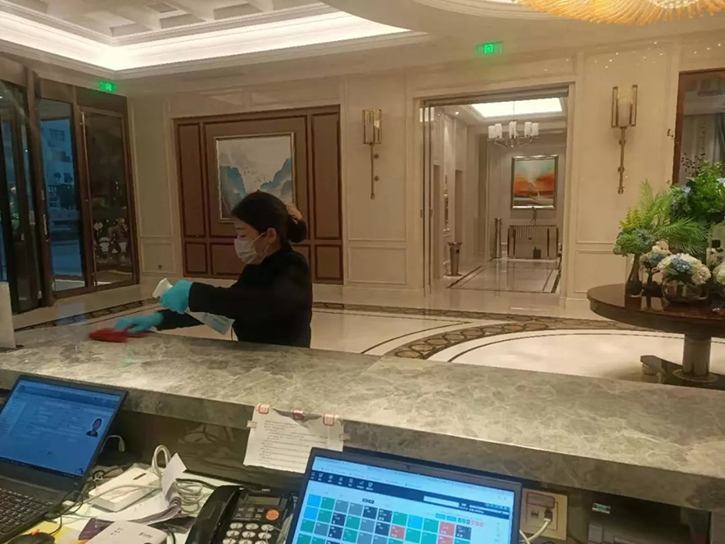 大堂、吧臺(tái)、每一間客房均放置了免洗消毒洗手液,為每一位進(jìn)入酒店的賓客提供免費(fèi)的清潔、消毒服務(wù)??头糠?wù)員每天打掃客房更認(rèn)真了,加大了對(duì)客房的消毒力度和頻率,嚴(yán)格保證客房物品一客一換,并在客房打掃清理干凈后開窗通風(fēng)30分鐘以上。