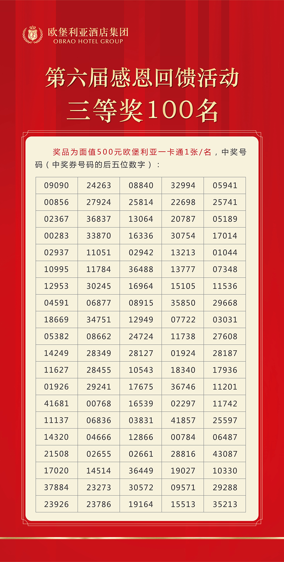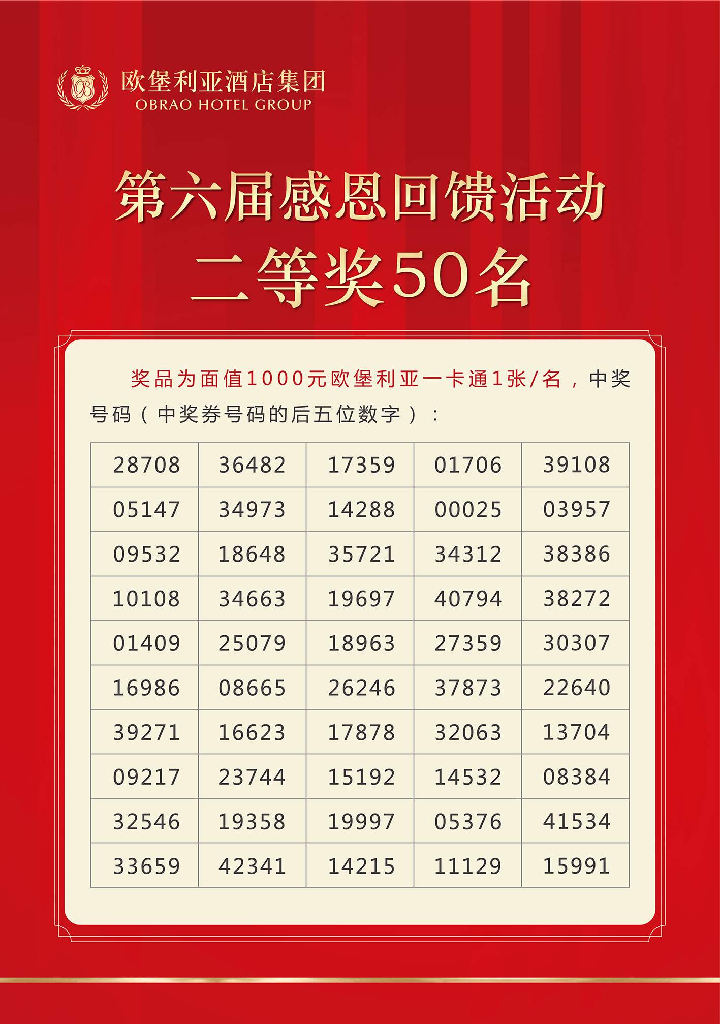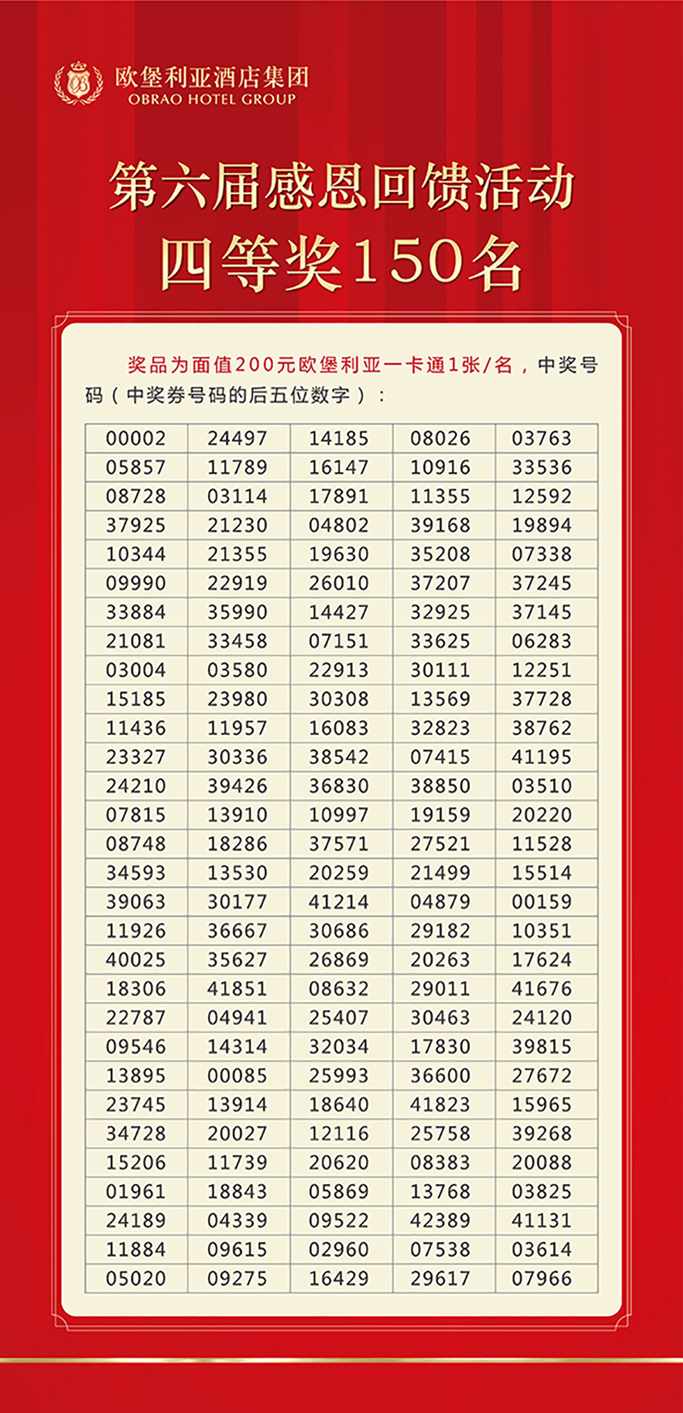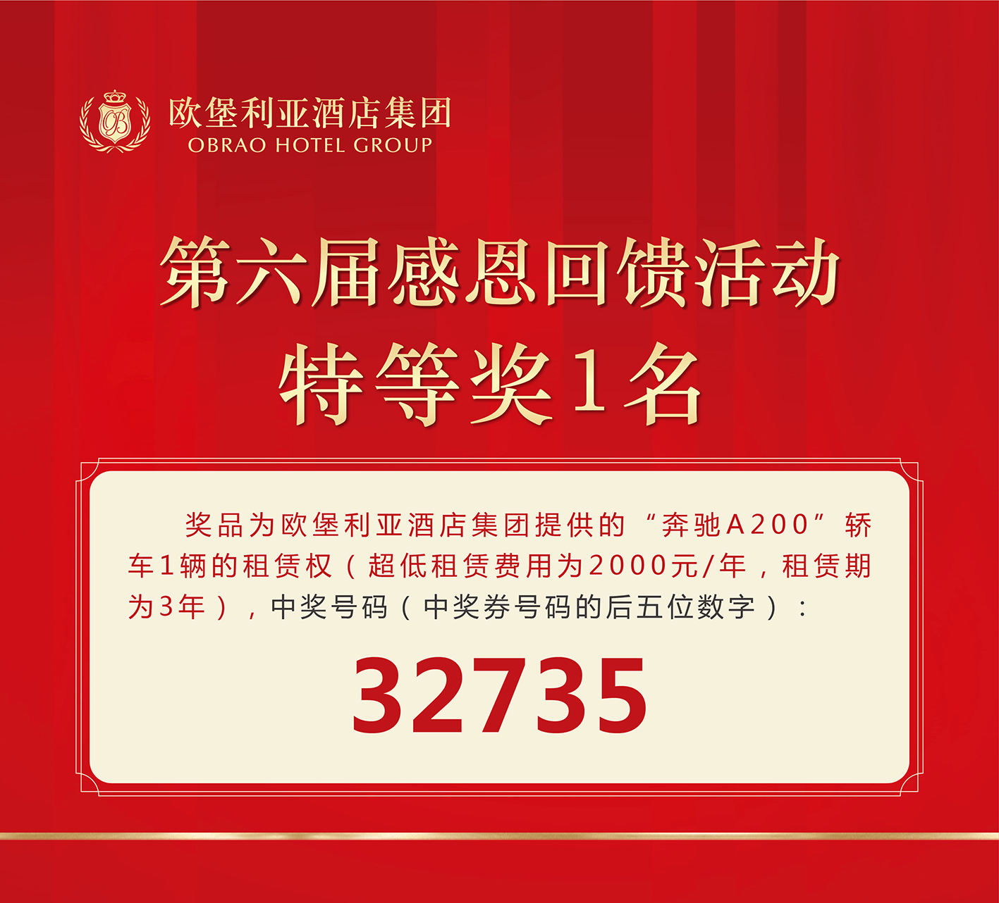 歐堡利亞酒店集團第六屆感恩回饋活動與眾不同的是抽取特等獎放在第一個抽獎環(huán)節(jié),其目的是讓所有持有本屆感恩回饋活動抽獎券的賓客朋友都能有中得特等獎的機會,特等獎的中獎號碼(中獎券號碼的后五位數(shù)字)是32735。