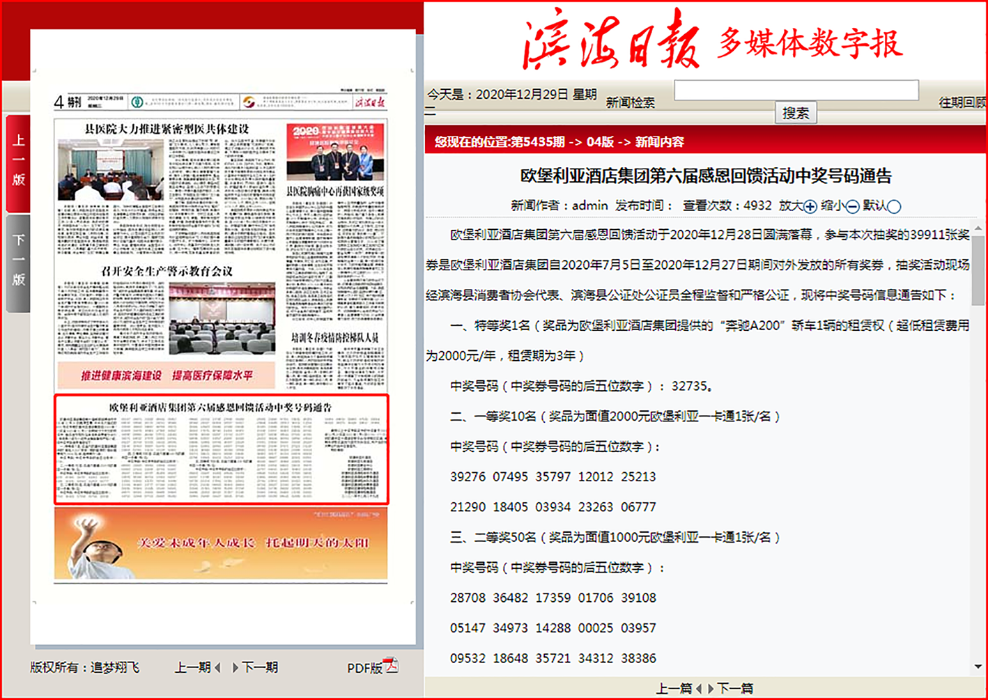 本次活動五個獎項的中獎號碼已在2020年12月29日《濱海日報》上公布。