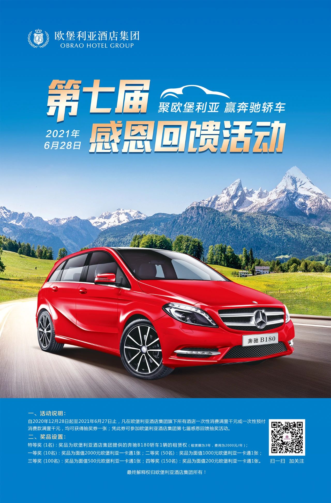 在第六屆感恩回饋活動接近尾聲時,“歐堡利亞酒店集團第七屆感恩回饋活動”正式啟動,凡在2020年12月28日至2021年6月27日期間,在歐堡利亞酒店集團旗下的所有酒店一次消費滿1000元或一次預付消費滿1000元的客戶,均可獲贈第七屆感恩活動抽獎券1張,讓更多的歐堡利亞酒店新老賓客朋友能享受消費之外的更大驚喜。
