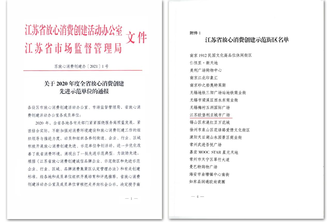 ▲江蘇歐堡利亞城市廣場(chǎng)被認(rèn)定為“省級(jí)放心消費(fèi)示范街”