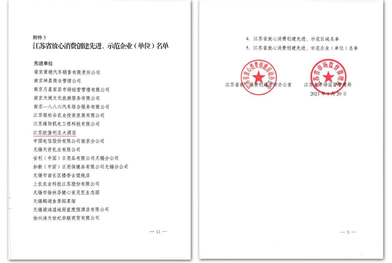 為全面提升疫情防控常態(tài)化下的消費(fèi)環(huán)境安全度、經(jīng)營(yíng)者誠(chéng)信度和消費(fèi)者滿(mǎn)意度,切實(shí)構(gòu)建誠(chéng)信經(jīng)營(yíng)、安全放心的消費(fèi)氛圍,致力打造讓社會(huì)各界人士買(mǎi)得放心、用得放心、吃得放心的行業(yè)標(biāo)桿,2021年1月21日,江蘇省放心消費(fèi)創(chuàng)建活動(dòng)辦公室、江蘇省市場(chǎng)監(jiān)督管理局聯(lián)袂公布“2020年度全省放心消費(fèi)創(chuàng)建先進(jìn)示范單位”名單,由歐堡利亞酒店集團(tuán)精心締造的江蘇歐堡利亞城市廣場(chǎng)榮膺“2020年度江蘇省放心消費(fèi)創(chuàng)建示范街區(qū)”稱(chēng)號(hào),歐堡利亞大酒店榮膺“2020年度江蘇省放心消費(fèi)創(chuàng)建先進(jìn)單位”稱(chēng)號(hào),鹽城市僅6條街、濱??h僅1條街成功獲評(píng),濱海縣目前唯一1家單位被認(rèn)定為“2020年度江蘇省放心消費(fèi)創(chuàng)建先進(jìn)單位”。
