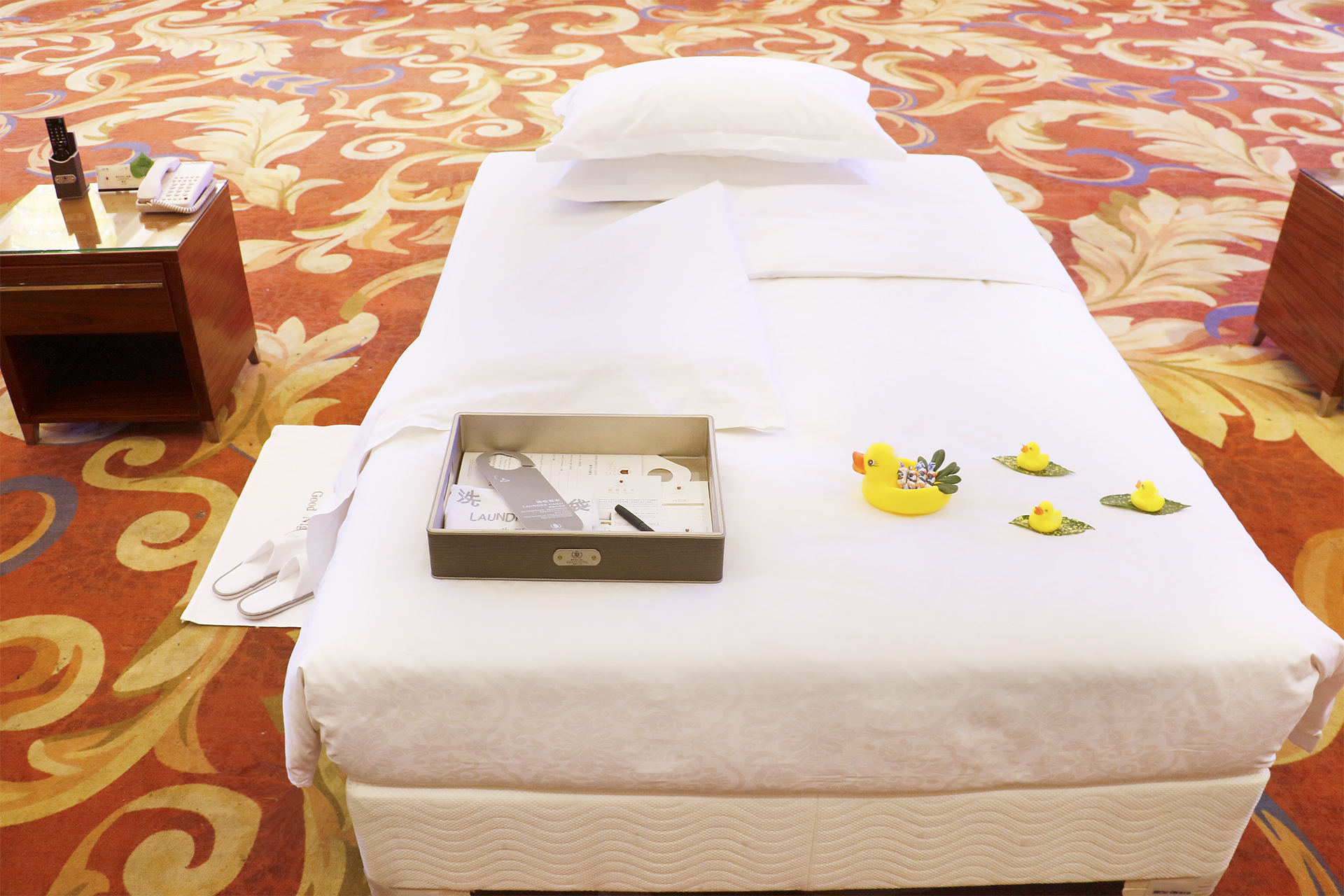 客房服務(wù)的參賽選手雙手抓住床單的兩角,床單向床頭飛出,隨即往下一按,一手平伸一撫,一手輕抬床墊,撫床單的手再做成手刀往床底下一砍,床單的一角就坦蕩如砥地壓在床墊下,有條不紊、一氣呵成的動(dòng)作頻繁劃出了一道道優(yōu)美的弧線,床腳呈現(xiàn)出一個(gè)標(biāo)準(zhǔn)的90度,四周緊密無(wú)褶皺,一張舒適、整潔、美觀的床就在3分鐘內(nèi)鋪就完畢;創(chuàng)意新穎、實(shí)用性強(qiáng)、藝術(shù)感好的一件件夜床作品凸顯了客房服務(wù)參賽選手對(duì)賓客的感動(dòng)式服務(wù)、個(gè)性化關(guān)懷,為大賽評(píng)委和觀摩人員呈現(xiàn)了一場(chǎng)美輪美奐的視覺盛宴。