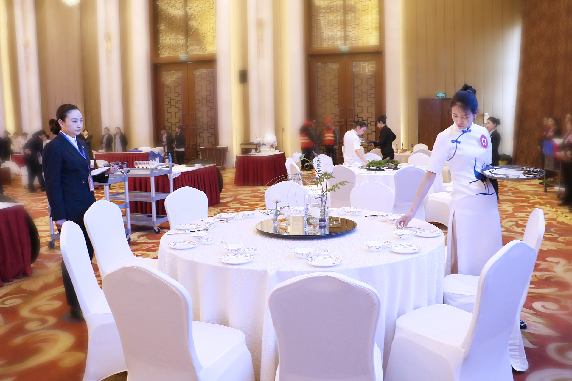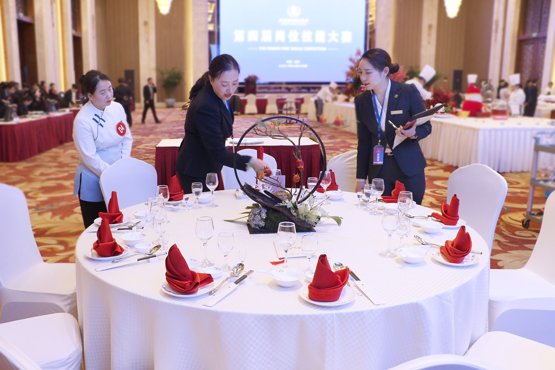 第四屆崗位技能大賽設(shè)有客房服務(wù)(分為A、B兩組)、餐廳服務(wù)(分為A、B兩組)、前廳服務(wù)(分為A、B兩組)、熱菜制作、冷菜制作、精細(xì)刀工、保安實(shí)操、工程維修、財(cái)務(wù)技能共計(jì)9個(gè)比賽項(xiàng)目,經(jīng)過(guò)參賽部門、參賽單位的學(xué)習(xí)標(biāo)準(zhǔn)、組織培訓(xùn)、強(qiáng)化練習(xí)、層層選拔強(qiáng)化培訓(xùn)和層層選拔,參賽選手充分利用8小時(shí)之外的業(yè)余時(shí)間,盡管日常工作后有著些許勞累,卻依然毫無(wú)怨言地苦練崗位技能、用心奮力備賽。在主持人宣布第四屆崗位技能大賽開始后,身穿職業(yè)裝、佩戴評(píng)委證的大賽評(píng)委偕同身著工作裝、別著參賽牌的參賽選手,精神飽滿、信心百倍地邁著整齊有力的步伐向各比賽區(qū)挺進(jìn)。