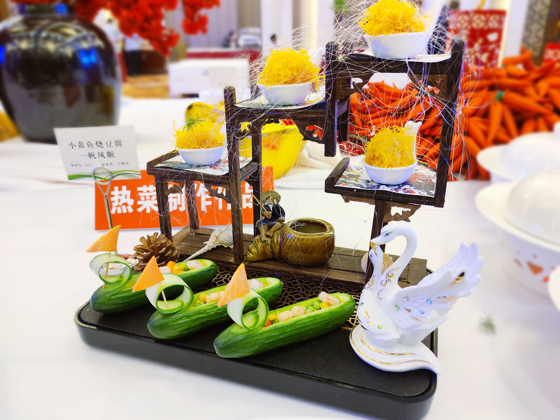 熱菜制作、冷菜制作、精細(xì)刀工的參賽選手紛紛拿出看家的本領(lǐng)、亮出練就的絕活,貌似很平常不過(guò)的每一道熱菜、每一盤冷菜、每一種面點(diǎn)、每一個(gè)刀法、每一項(xiàng)裝飾卻蘊(yùn)含著細(xì)致入微、精雕細(xì)琢、至真至誠(chéng),琳瑯滿目的精美食品燃起了一場(chǎng)味蕾風(fēng)暴,用色、香、味、形征服了賽場(chǎng)的所有人。
